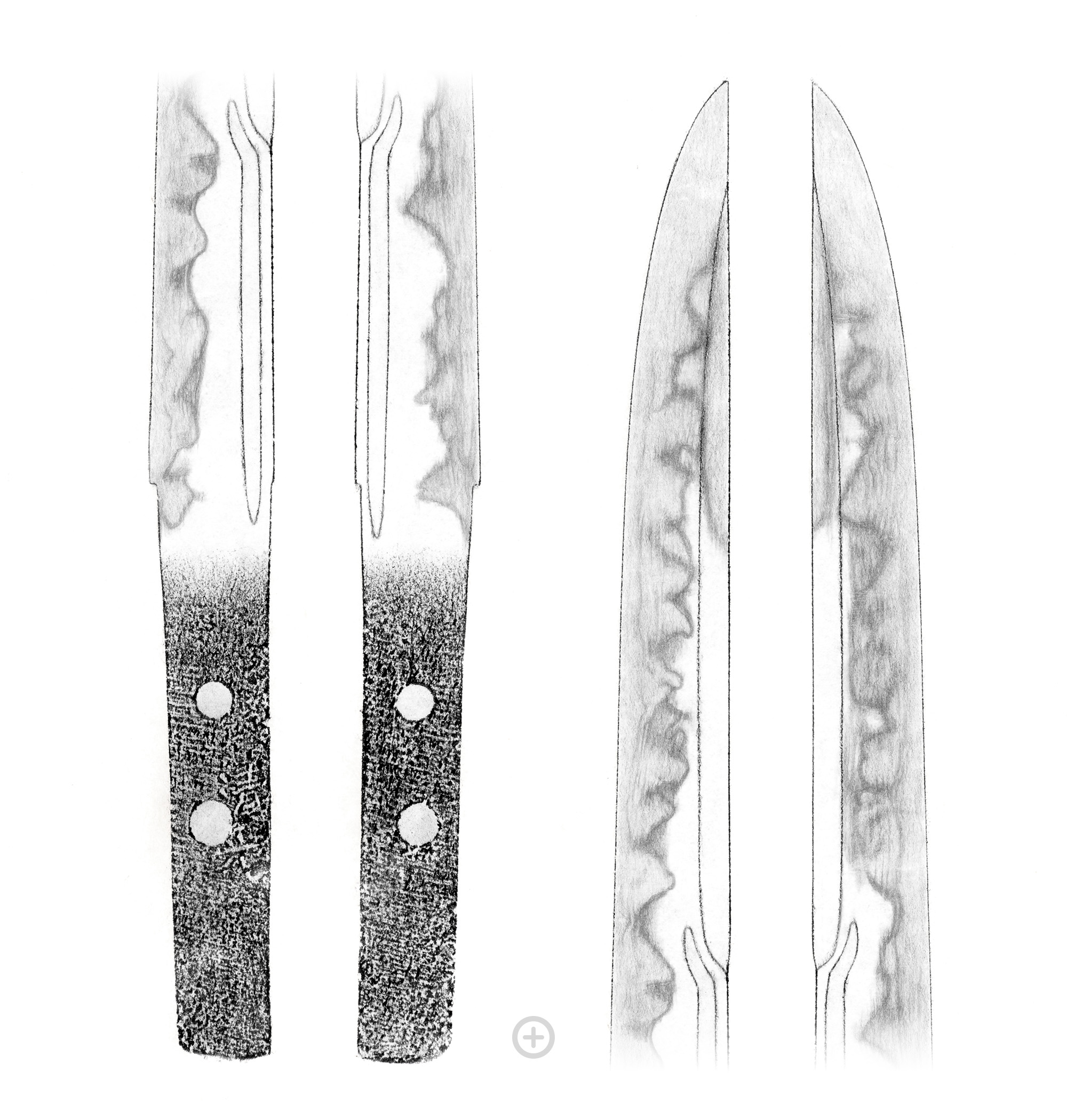- 匂口やや締り心、小沸出来の腰開きの乱刃。足・匂崩が現れ、刃中・刃寄は砂流掛る。